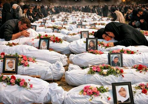 Eron janubidagi Xormozgan viloyati, Minab okrugidagi «Shajara Tayeba» boshlang‘ich qizlar maktabida o‘lgan o‘quvchilarni dafn etish marosimi. X ijtimoiy tarmog‘i fotosurati